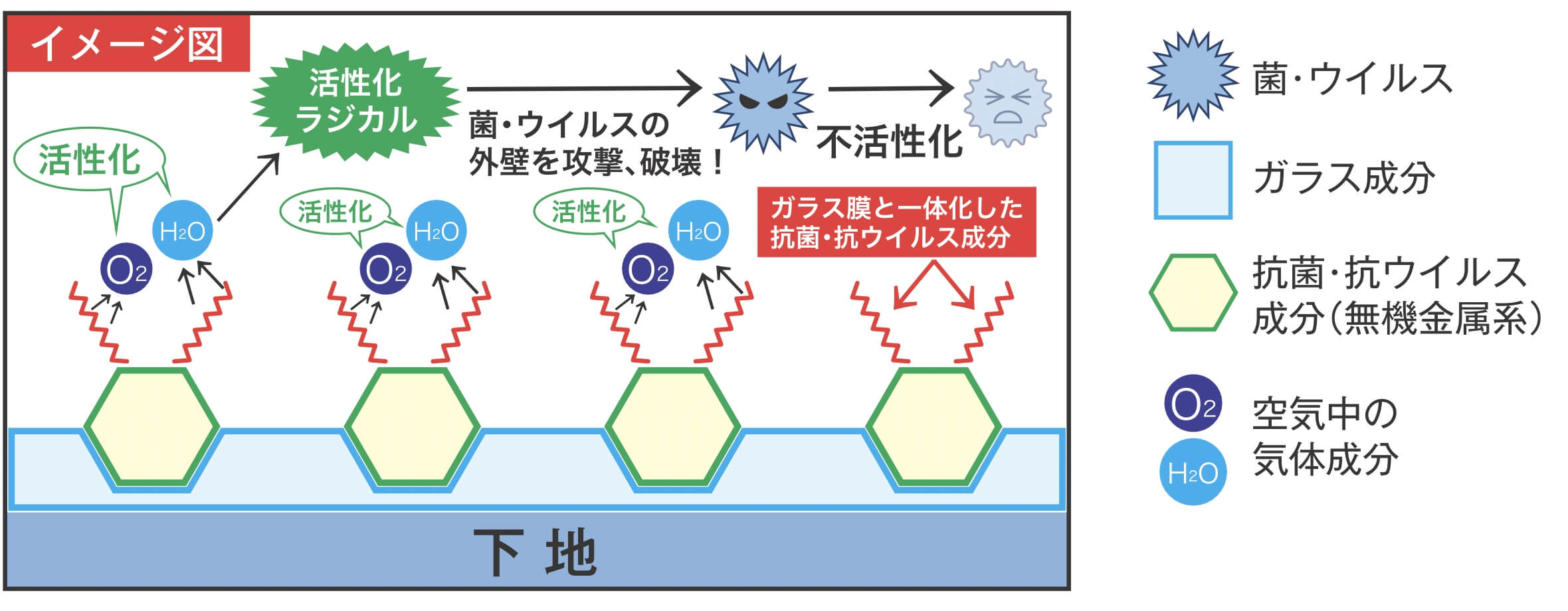 ③ガラス膜に抗ウイルス・抗菌成分が生成され、ガラス膜と一体化する。
