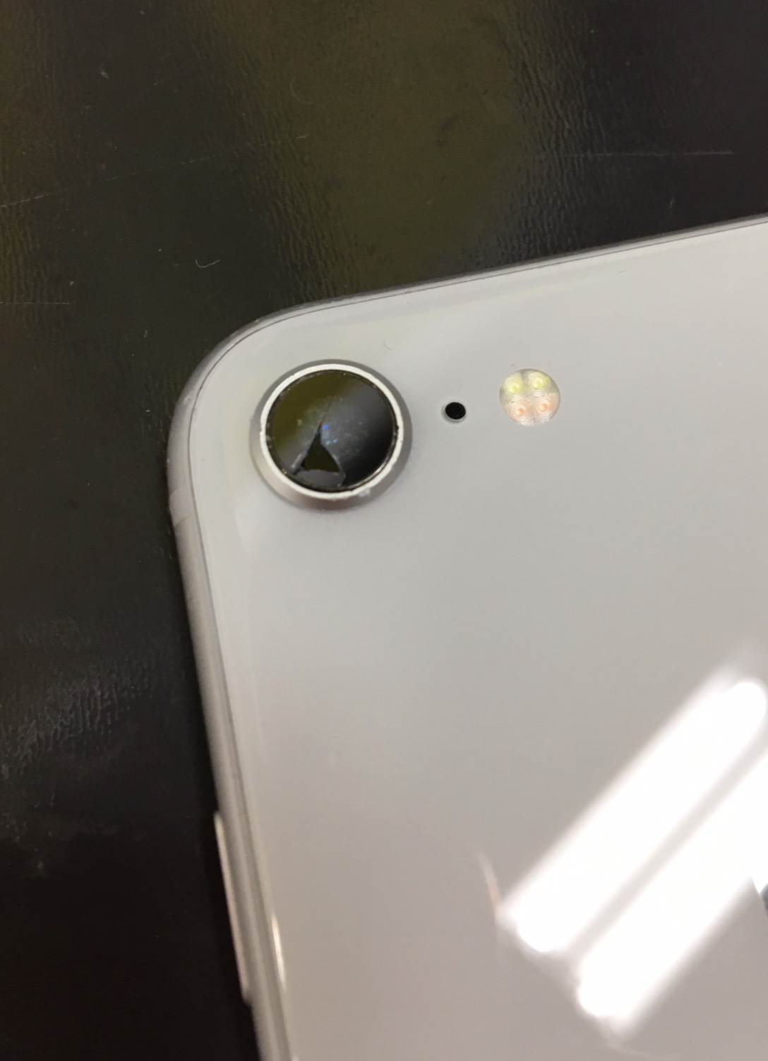 iPhone 8を持って来られたお客様に話を伺ってみると地面に落としてしまったらしいです。画面や背面パネルは割れたりは無かったそうなのですが運悪くバックカメラのレンズだけが写真のように欠けてしまったそうです。よく風景の写真を撮影してインスタグラムやTwitterに上げる趣味があった為、これではまともな撮影が出来ないということで今回の来店となったそうです。