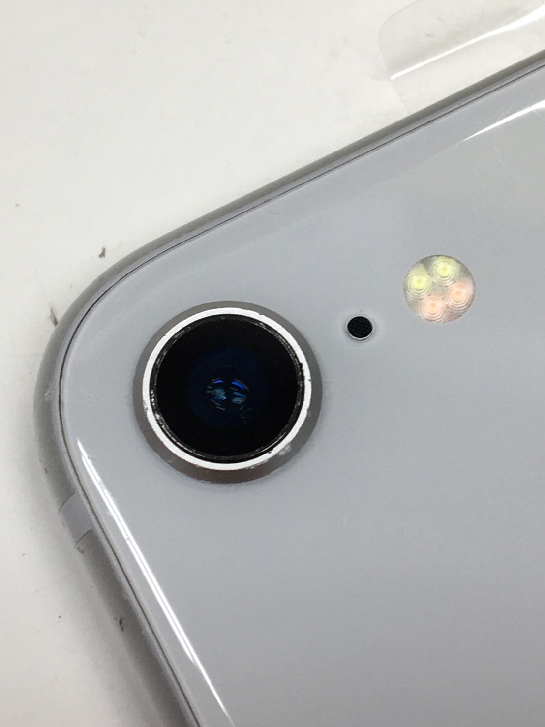 こちらの写真はiPhone 8のバックカメラの拡大写真になります。iPhone 8は2017年の秋に発売された第11世代のiPhoneになります。背面がガラス素材を使用しており、iPhoneシリーズとして初めてとなるワイヤレス充電に対応しております。今でも中古端末など人気が根強い機種の1つです。そんなiPhone 8ですがこの写真を見てみるとバックカメラのレンズが大きく欠けているのが分かると思います。実際にカメラを起動してみるとレンズが欠けてしまっているせいかピントがあわず上手く撮影する事が出来ませんでした。