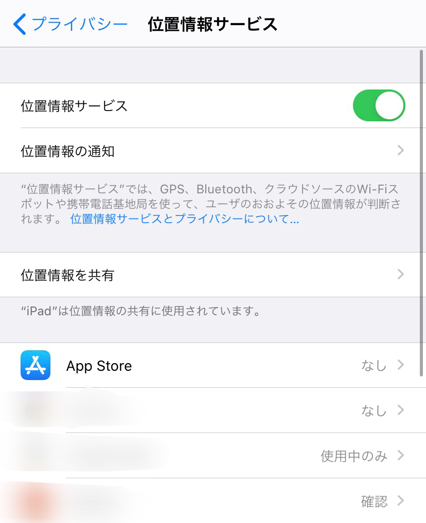 「なし」と書いているアプリは、位置情報サービスがOFFになっています。