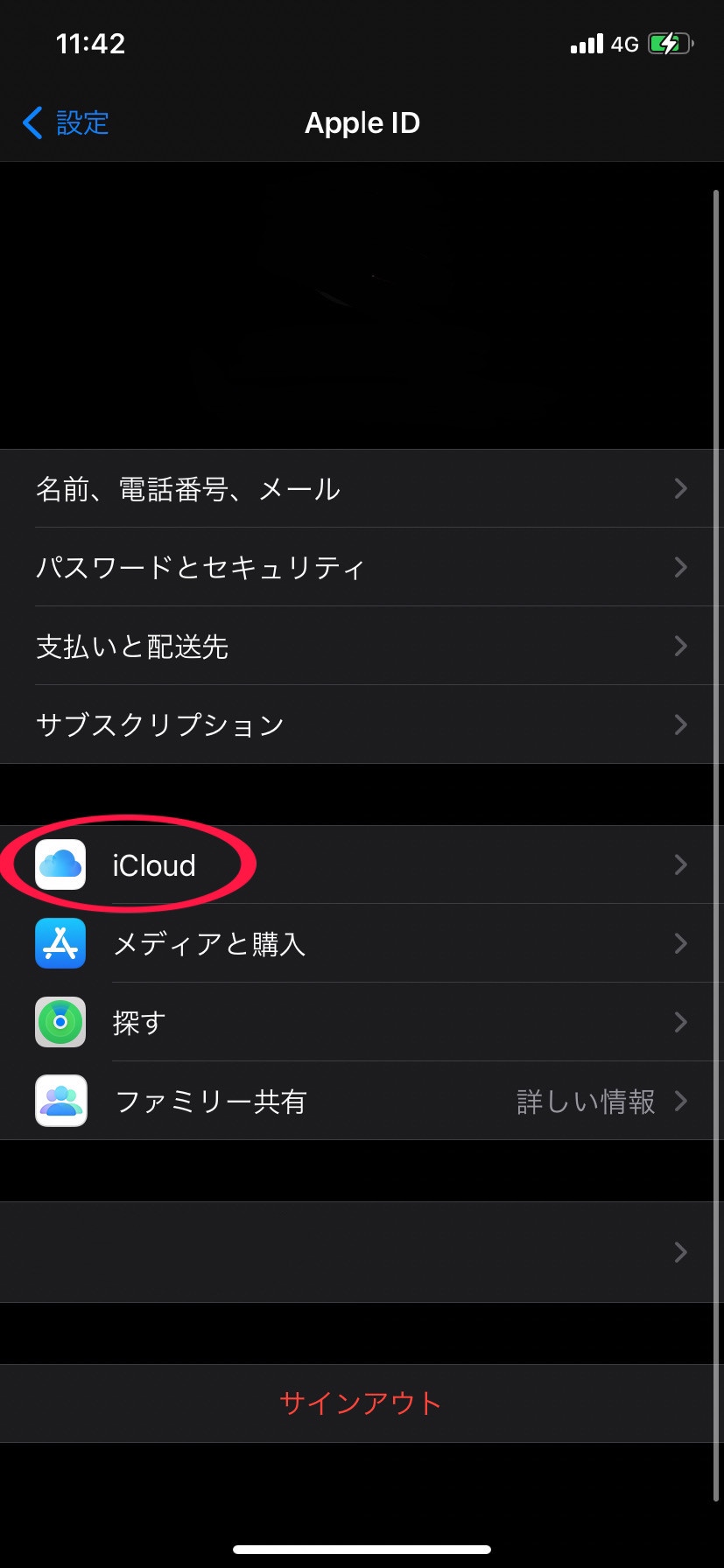 ②一番上に出てくる自分の名前を選択すると、真ん中にある「iCloud」を選択