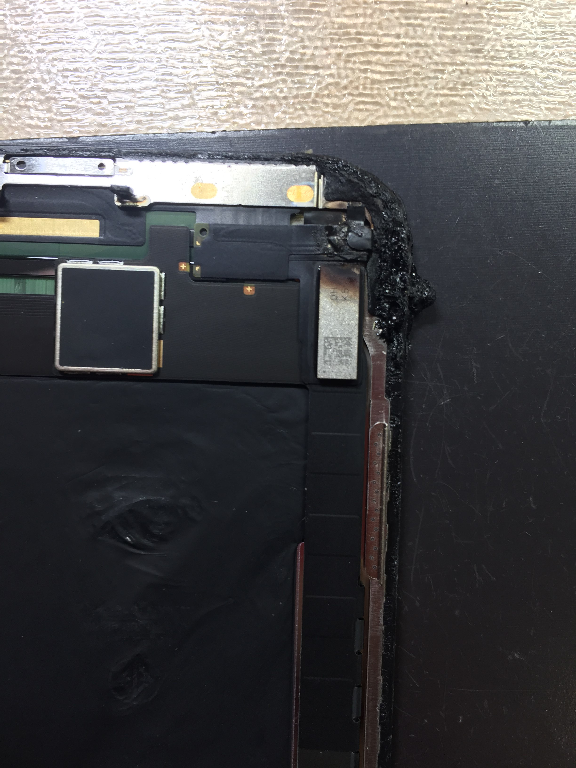 画面を外すと上部右側のタッチコネクタケーブルが焼け焦げていました。