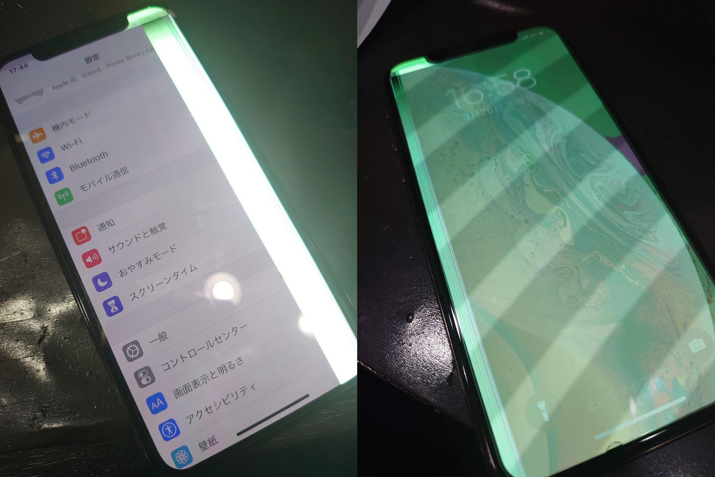 「画面に線が入る」という症状の大多数はハードウェア故障を原因としており、落下の衝撃などで液晶または有機ELディスプレイが破損した状態になります。上記写真のようにガラスが割れずに不具合が現れるケースもあり、黒や白線以外にもカラフルな線が何本も出るようなケースもあります。