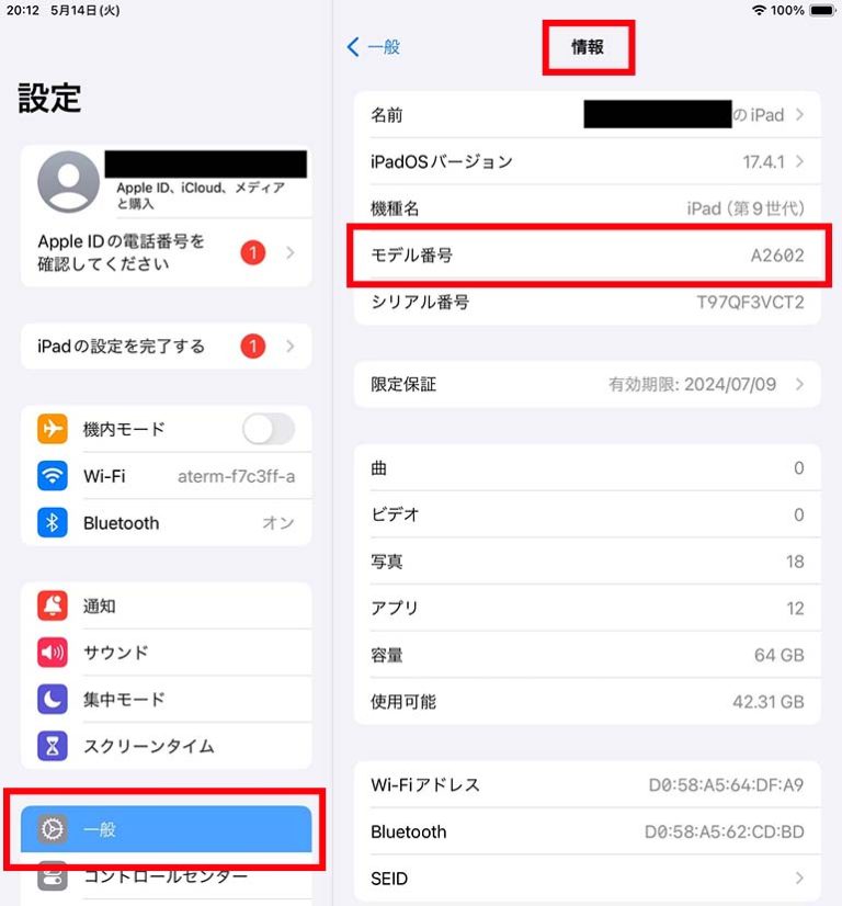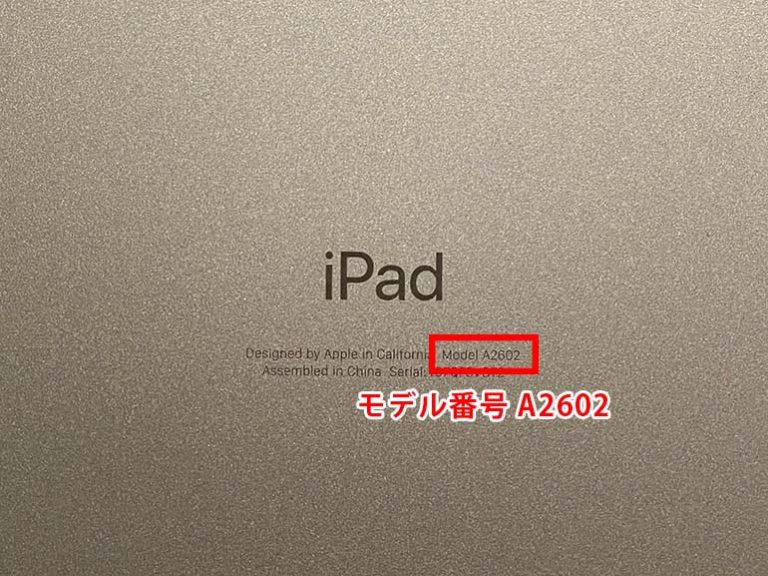 モデル番号(型番)の確認方法としては、iPadの背面(Appleロゴ下部)に印字されているモデル番号で確認する。または「設定」>「一般」>「情報」から「モデル番号」をタップすることでも確認できます。