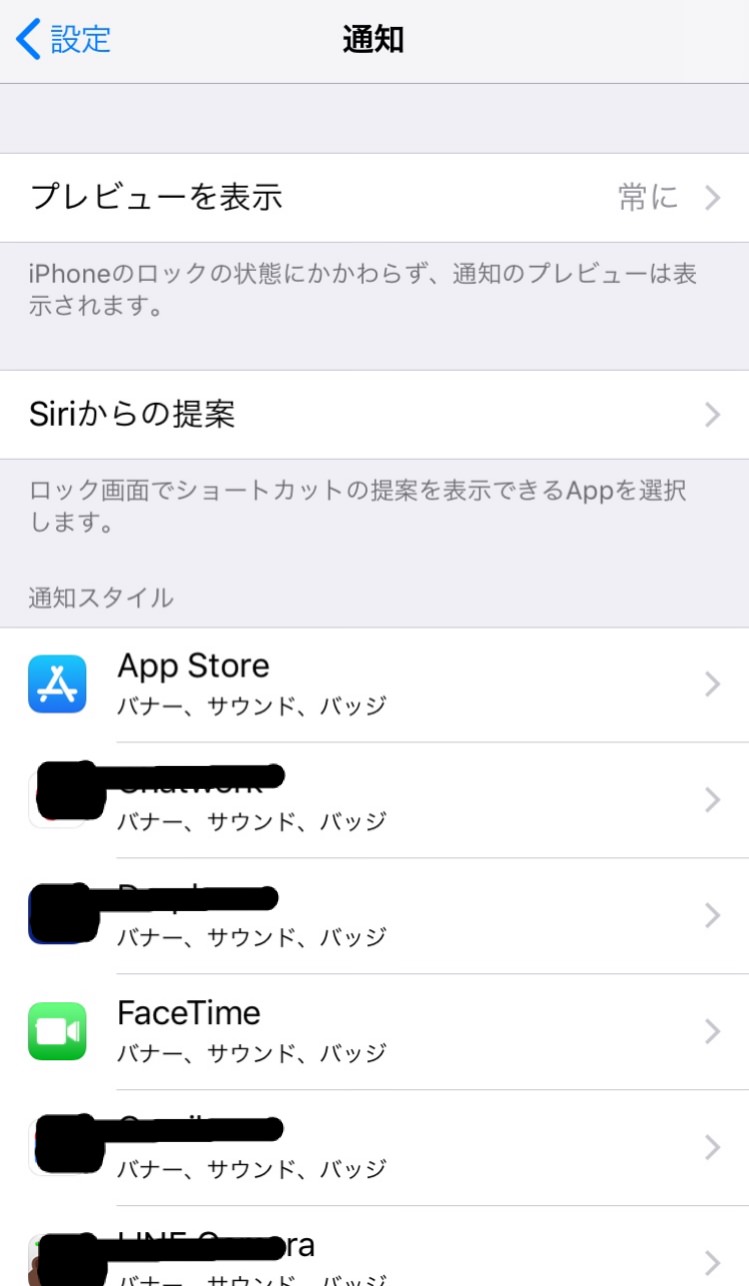 設定を開くと、比較的上の方に「通知」という項目がございます。これをタップすると各種通知に関する設定を行うことが出来ます。はじめに、「プレビューを表示」に関しては、通知の内容を表示するかどうかを選択できます。メッセージの内容などを他の人に見られたくない場合には、一括で「しない」にしておくことが出来ます。続いて、「Siriからの提案」ですが、ホーム画面トップやロック画面から左にスワイプするとデフォルトの状態であれば「Siriからの提案」のウィジェットがあるかと思います。よく使うアプリに簡単にアクセスできるものではありますが、そこに表示するアプリ、しないアプリを設定できるため、普段は使わないアプリを表示させないようにすることはもちろんですが、コッソリ使用しているアプリを表に出さないようにも出来ます。また、ロック画面のみでスワイプした際に提案させない設定を一括で行うことも可能です。