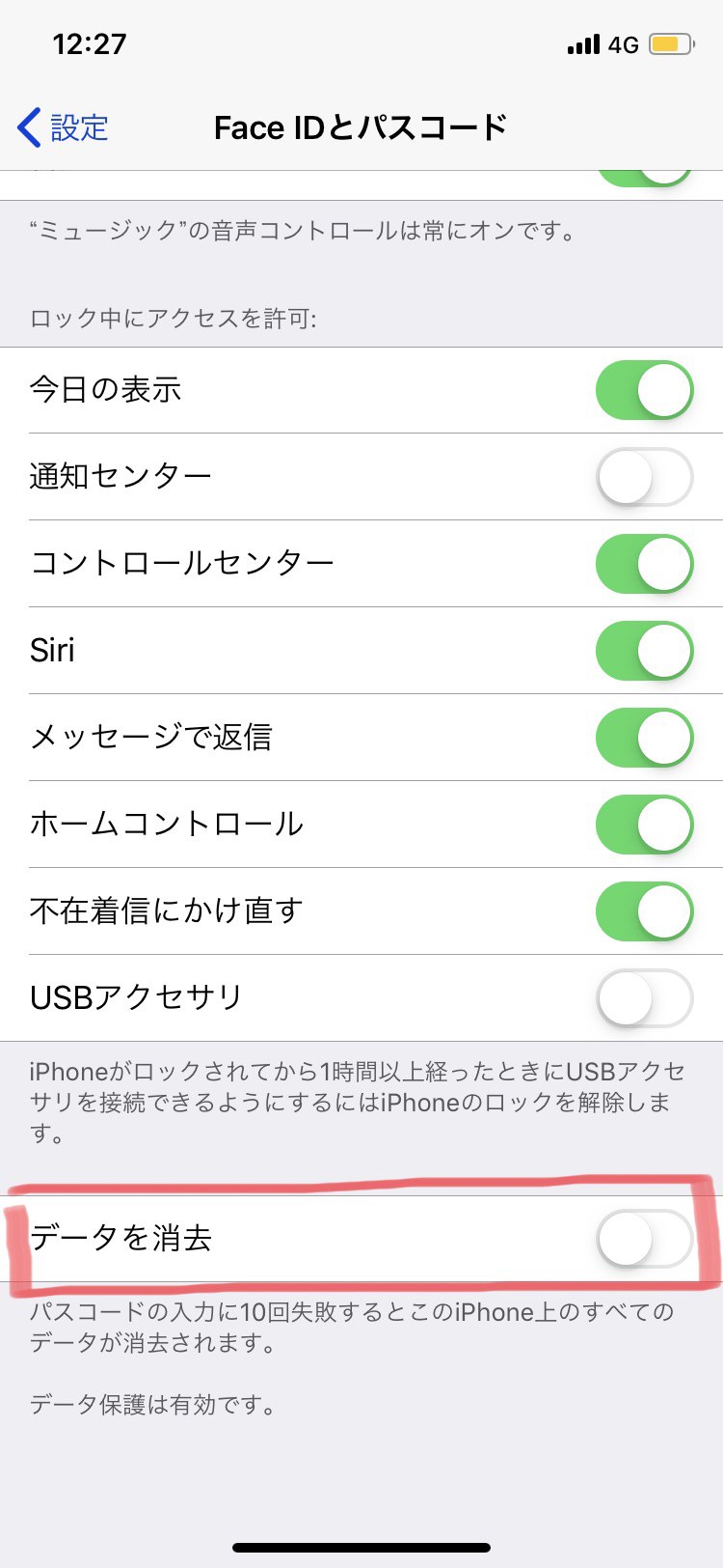 この項目をOFFにする、もしくはOFFになっていることが確認できれば、パスコードを何度間違えてしまってもデータが削除される心配はなくなります。