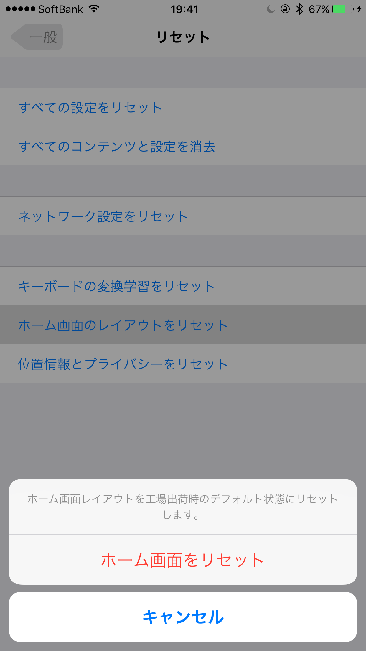 すると工場出荷時のデフォルト状態にするかの確認が出ますので、ホーム画面をリセットをタップすれば初期状態のレイアウトにすることができます。