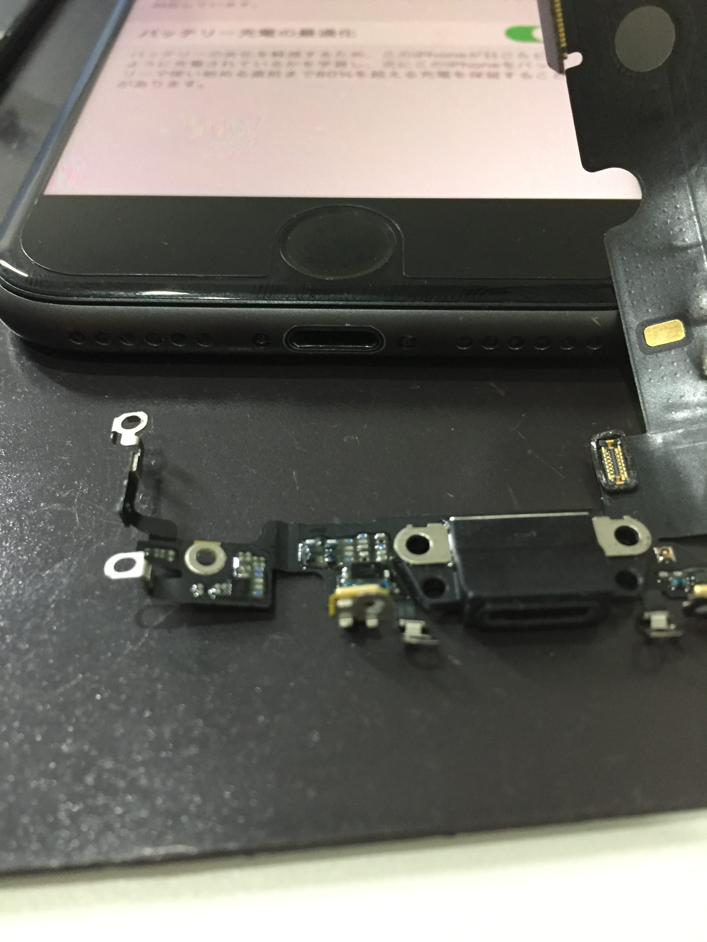 充電やマイクのテストで問題なければパーツ交換を行いますが、充電口パーツであるドックコネクターは、そのほとんどが本体基板の取外しを必要とする修理になります。そのため、充電口交換が必要だった場合、他の修理に比べると長くお時間を頂く事になります。