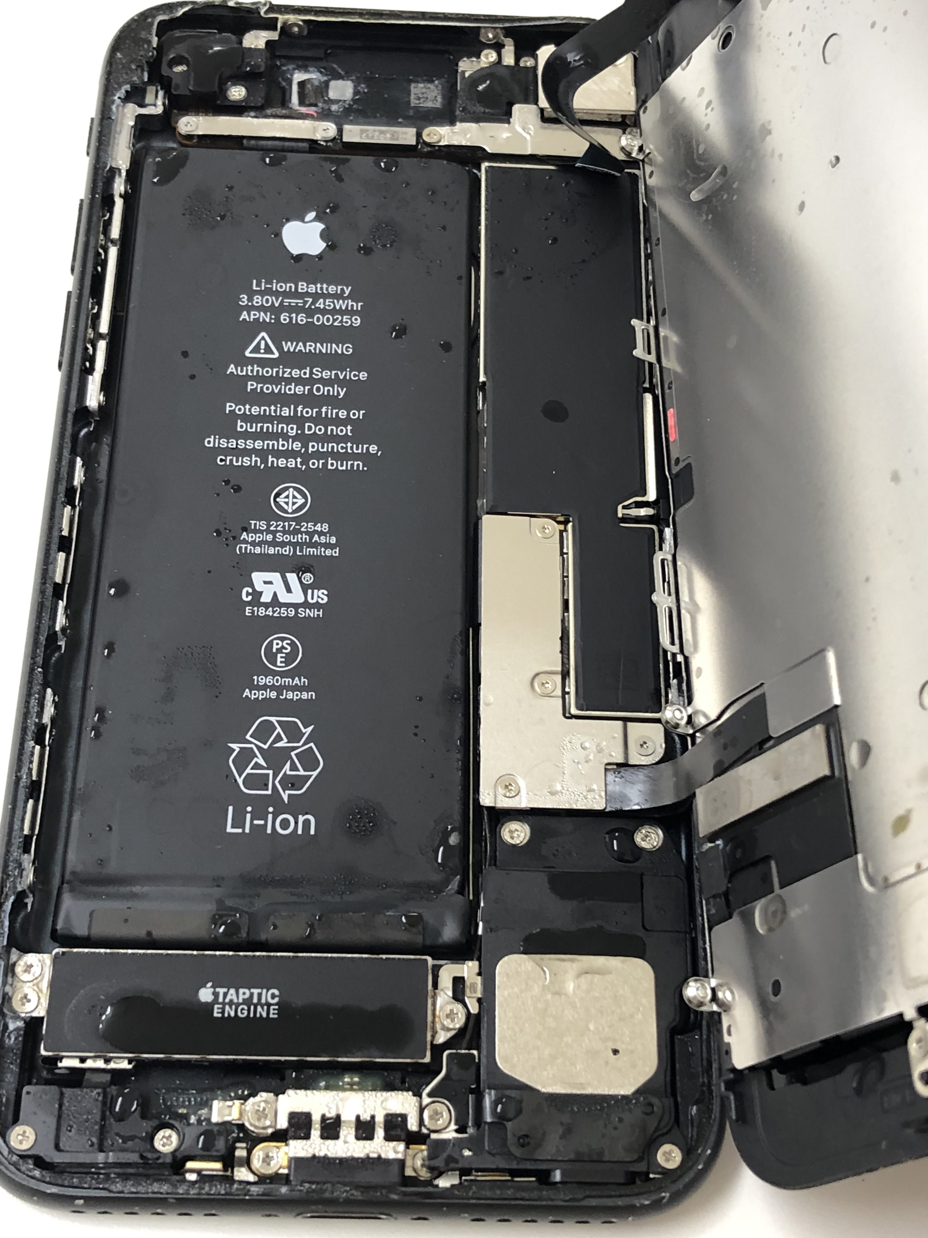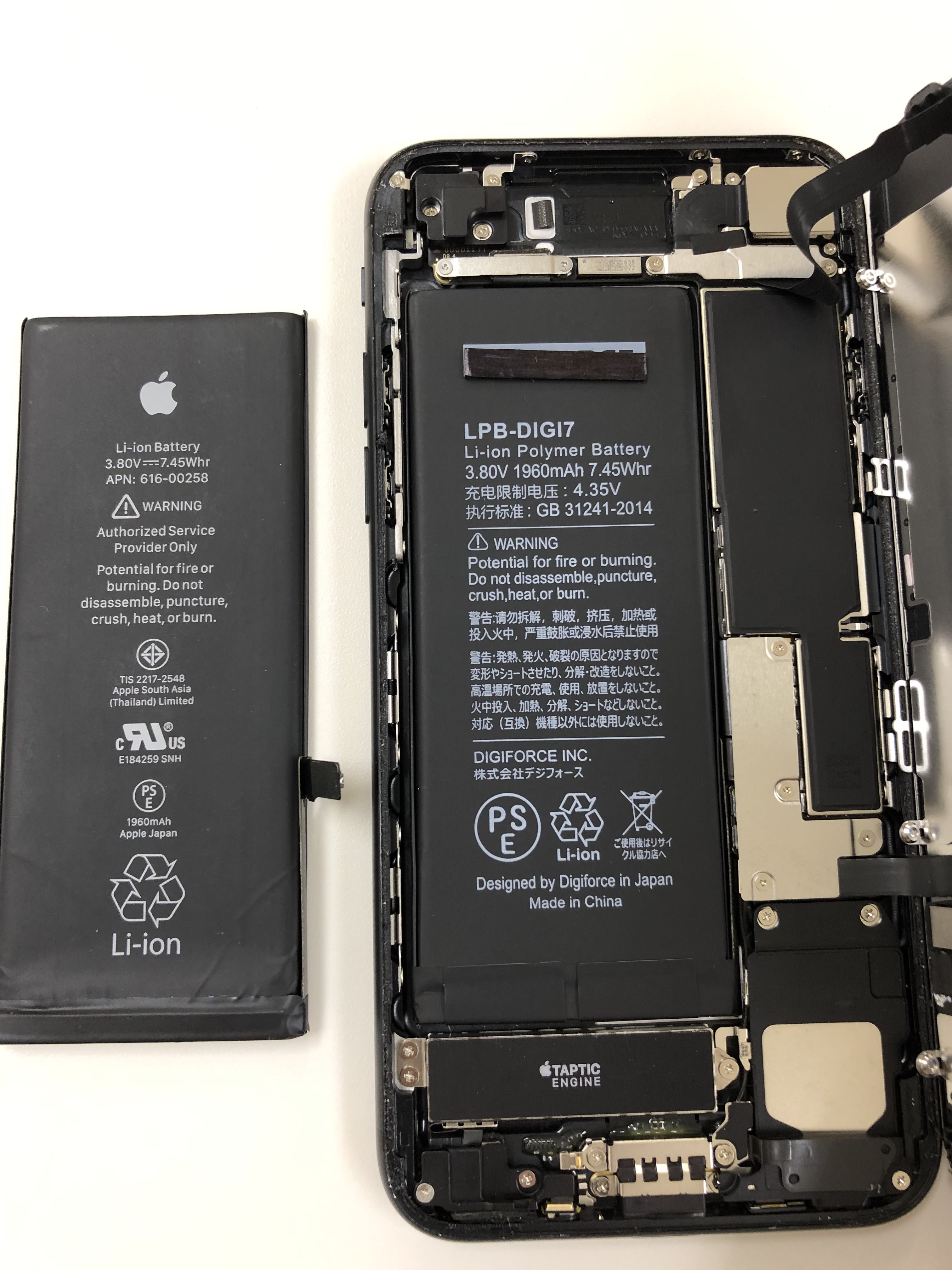 iPhoneの中身は大体の位置は同じ位置に付いています。例えばiPhoneの裏側(画面と反対側)を見たときに向かって左側が熱いといった症状の時はそこには基板がありますので基板が何らかの原因で激しく動作することにより発生します。その熱はバッテリーから供給されているのでバッテリーの減りが早くなります。このようにiPhoneの裏側を見て左側が熱ければ基板が熱いといったことになります。逆に裏側の右側が熱くなることは少ないですがもしそのような症状が出ましたら一刻も早くバッテリー交換や機種変更をオススメいたします。