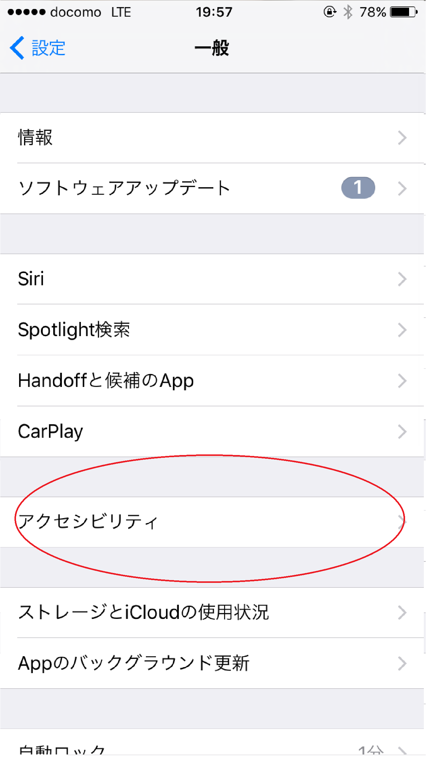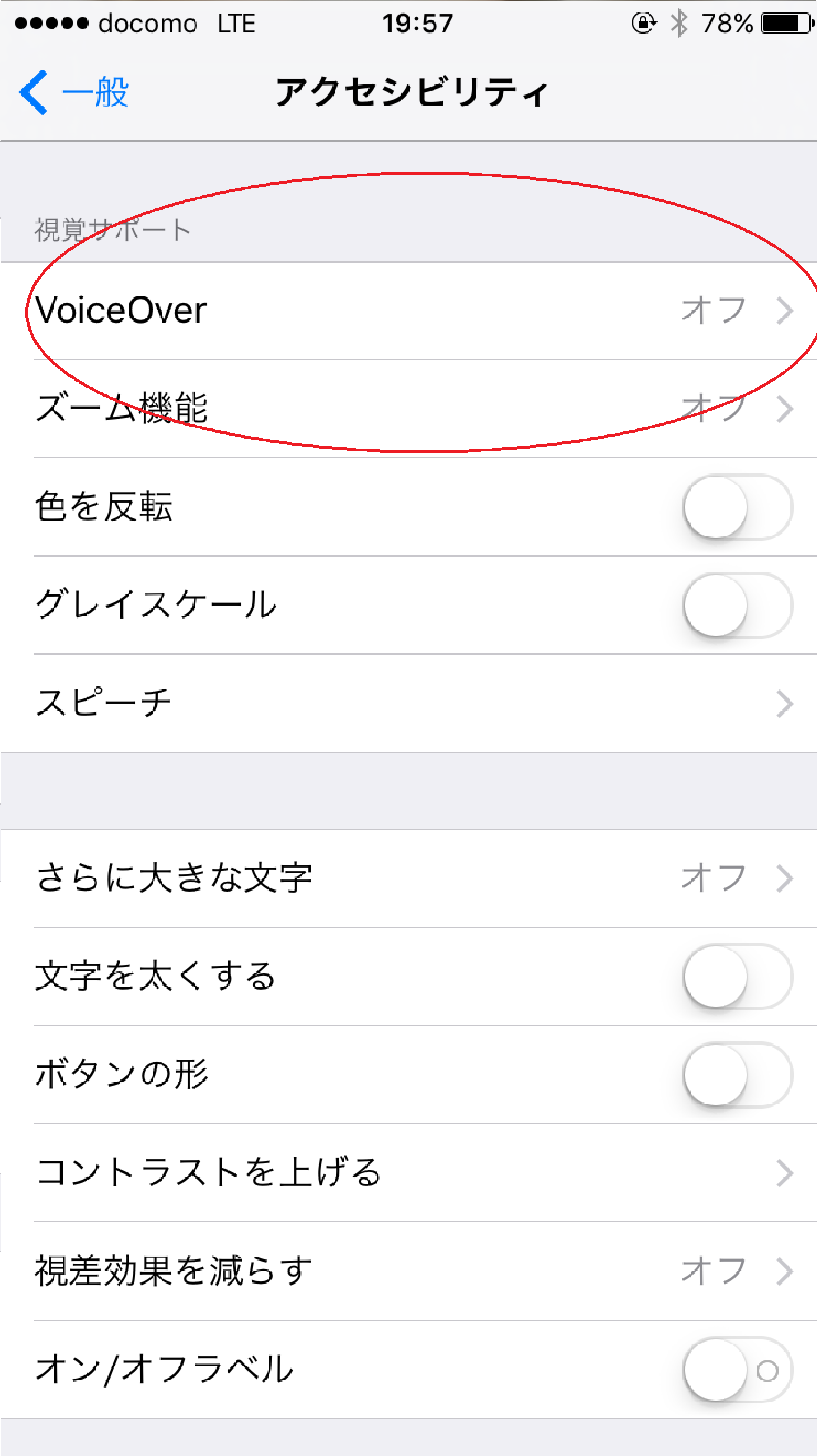 また赤丸で囲まれた「アクセシビリティ」を1度タップした後再度2度タップ続いてこの画面