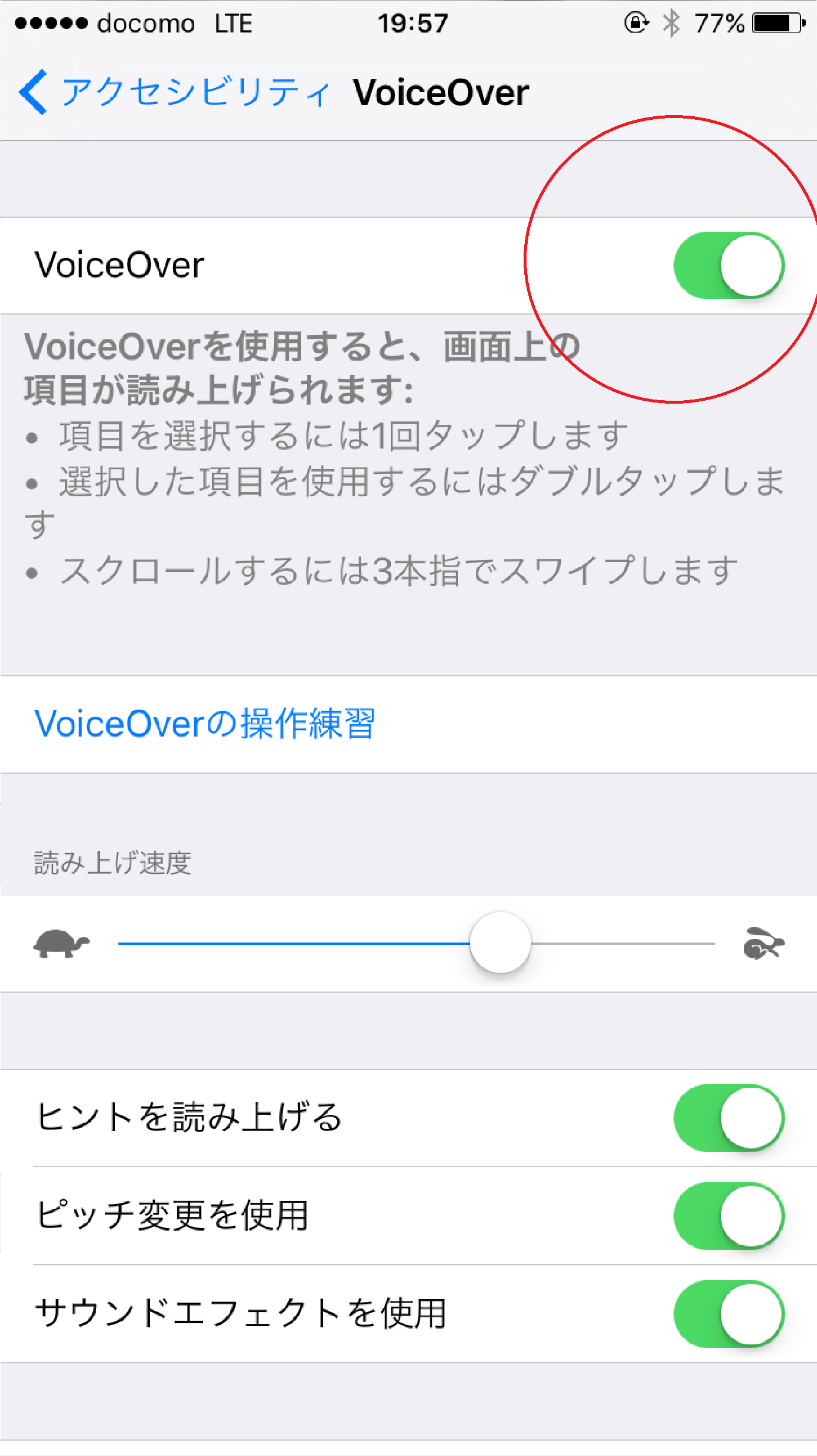 赤丸で囲まれた「Voice Over」を1度タップして再度2度タップこの画面が表示されます。