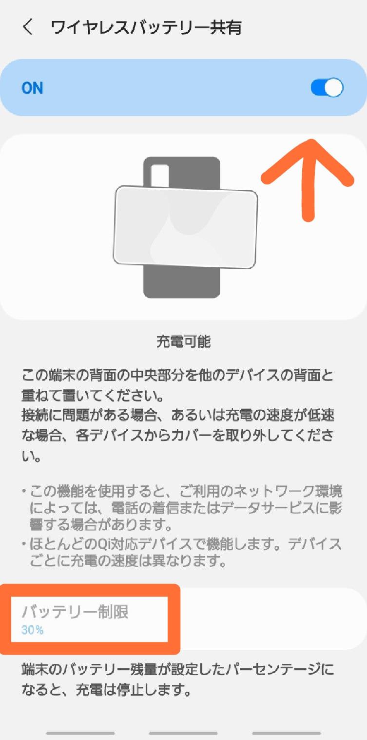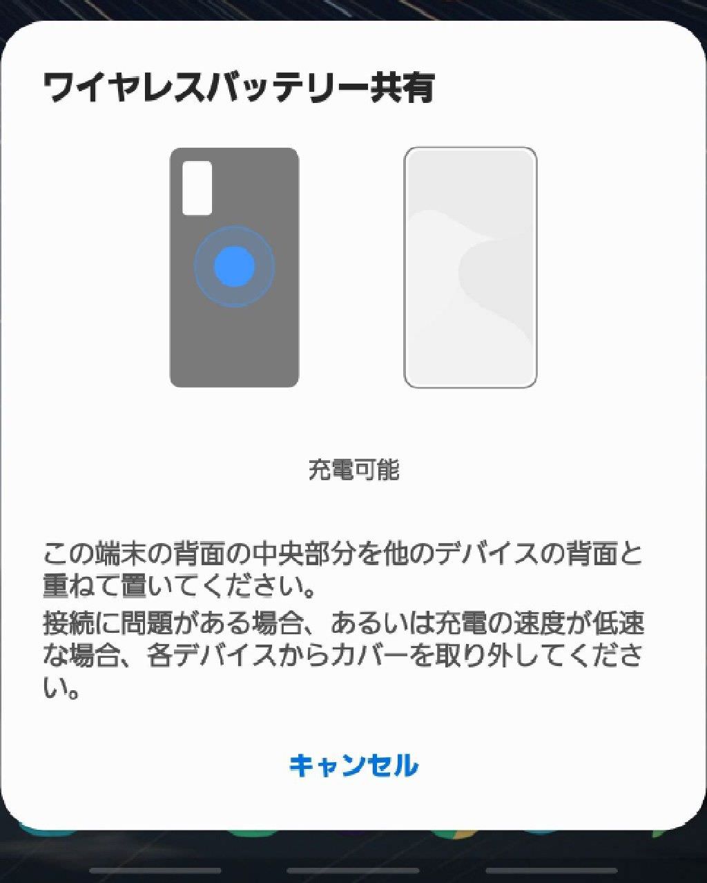 さてさて、これが「ワイヤレスバッテリー共有」の画面になります。