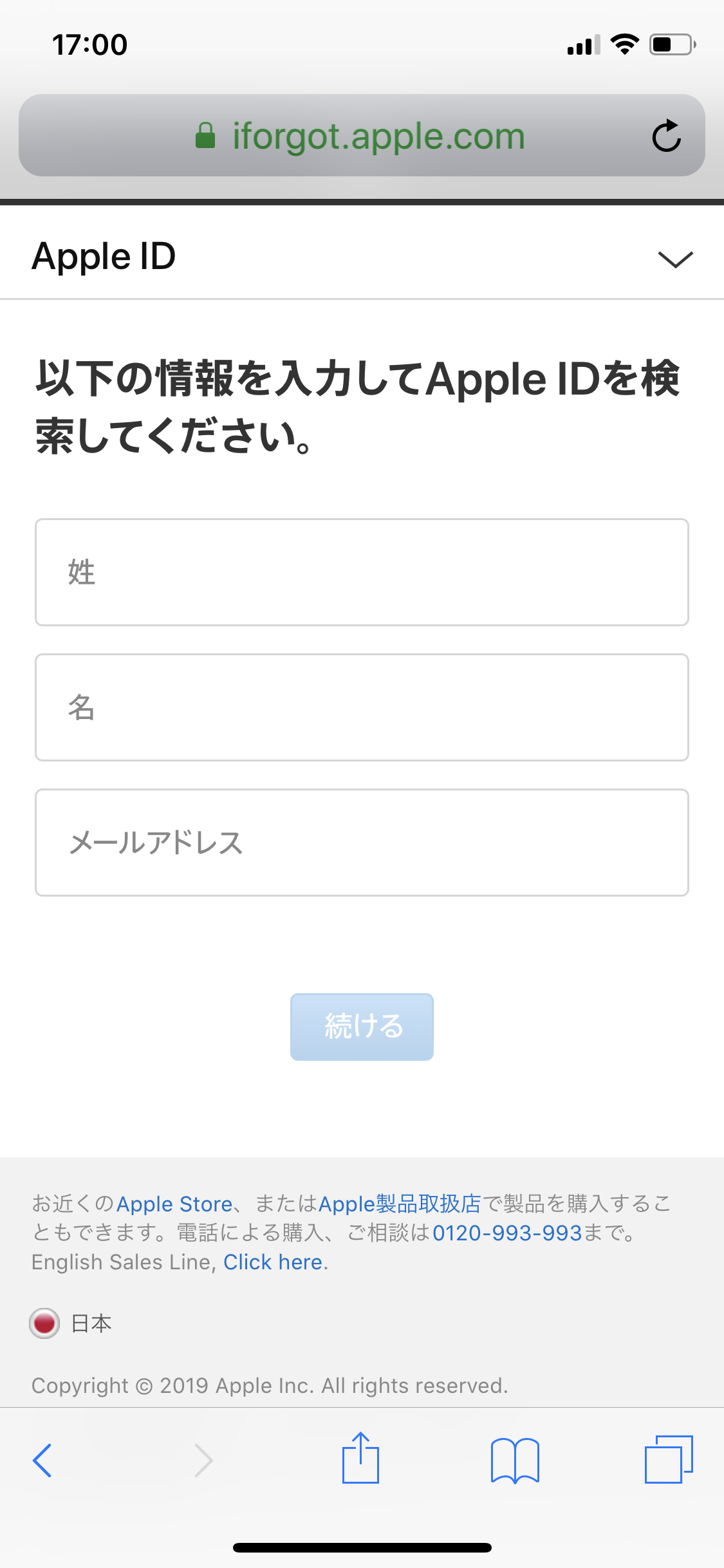 次にメールアドレスですがここには思い当たるメールアドレスを入力して「続ける」を押します。