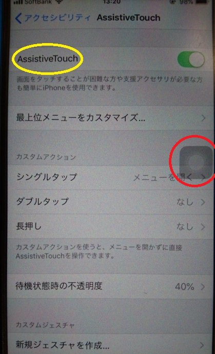 ④「AssistiveTouch」のをオンにする事で画面上にホームボタン(画像の赤い〇で囲んだ部分)が出現します。