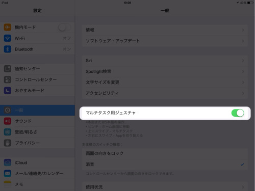 ①まず「設定」→「一般」で「マルチタスク用ジェスチャ」をONにする