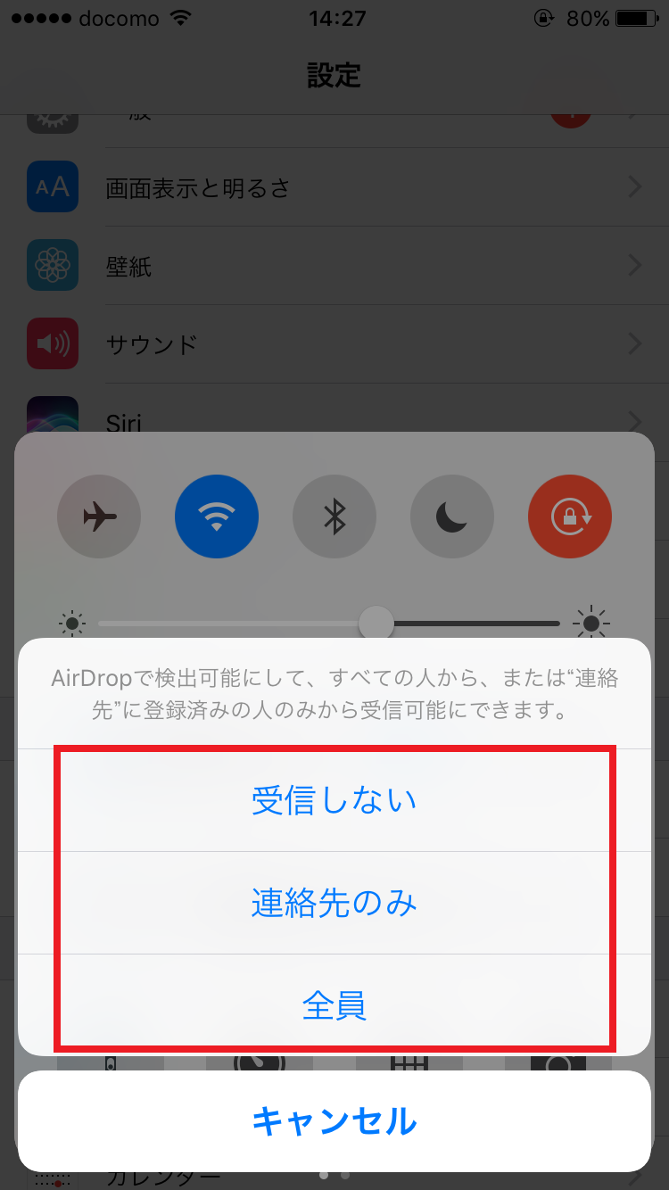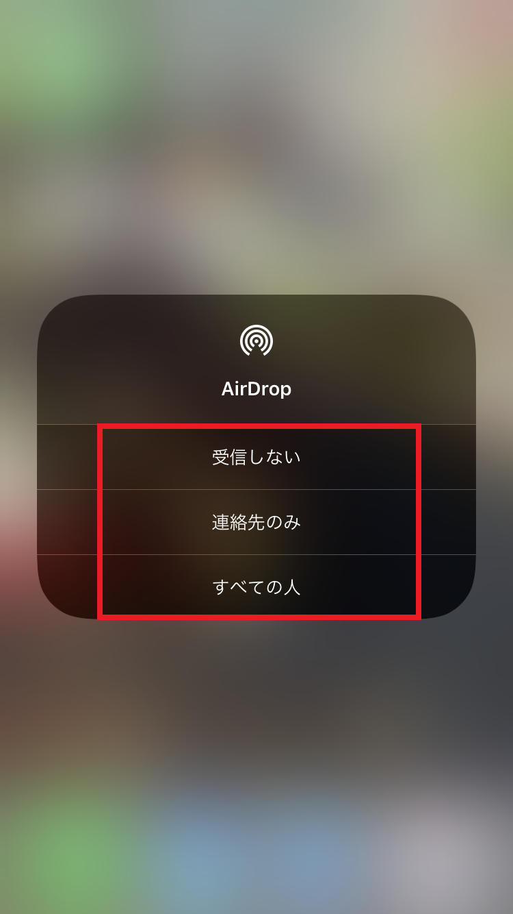 AirDropの所をタップして連絡先のみ又は全員を選択します。