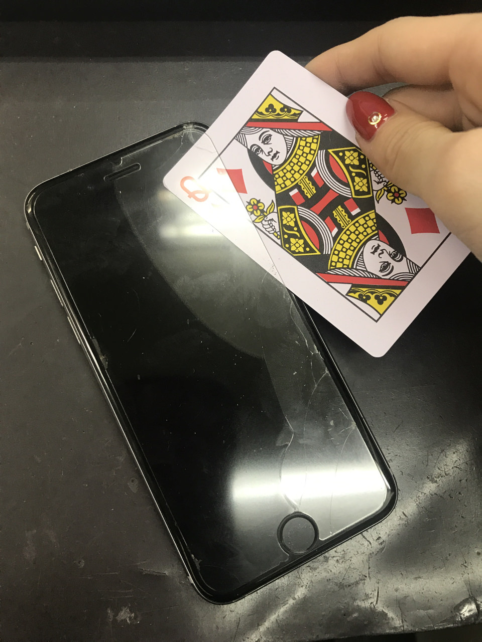 四隅にカードなどをスッと入れていくと剥がしやすいので、トランプやクオカードなどを端に入れて、ガラスフィルムを浮かしてください。