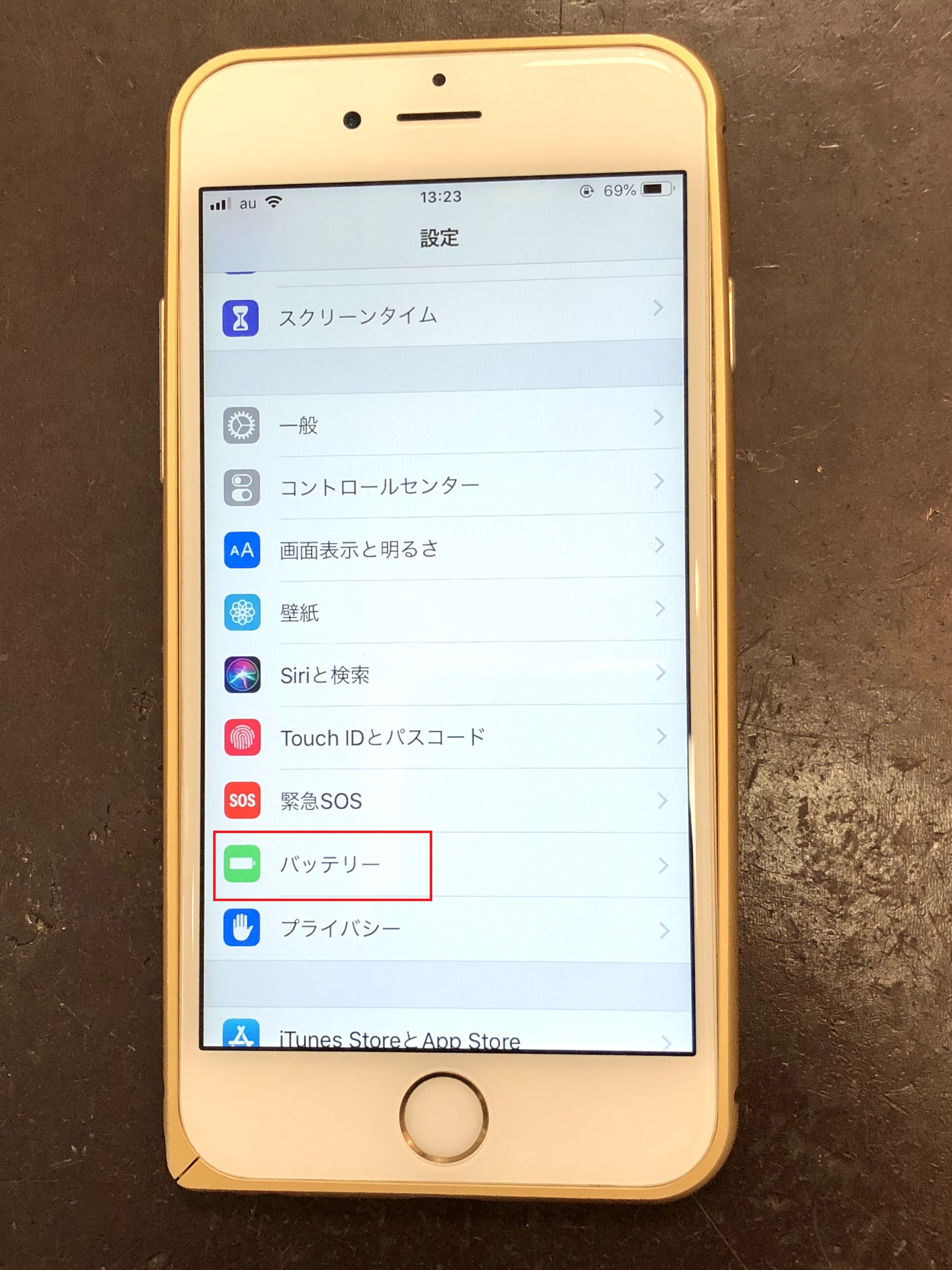 ①「設定」の中の「バッテリー」をタップ。