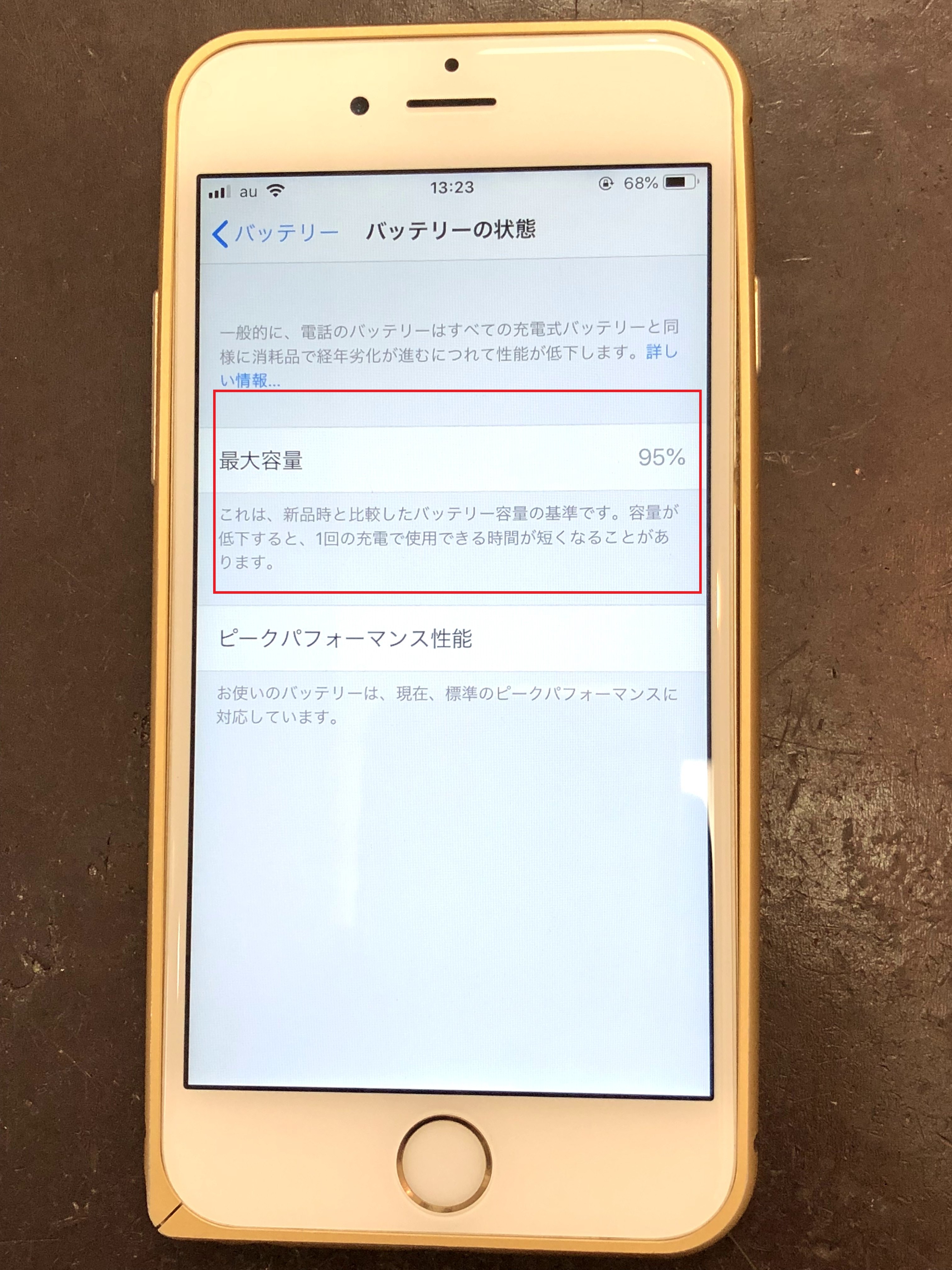 このiPhoneの場合、バッテリーの最大容量は95%。