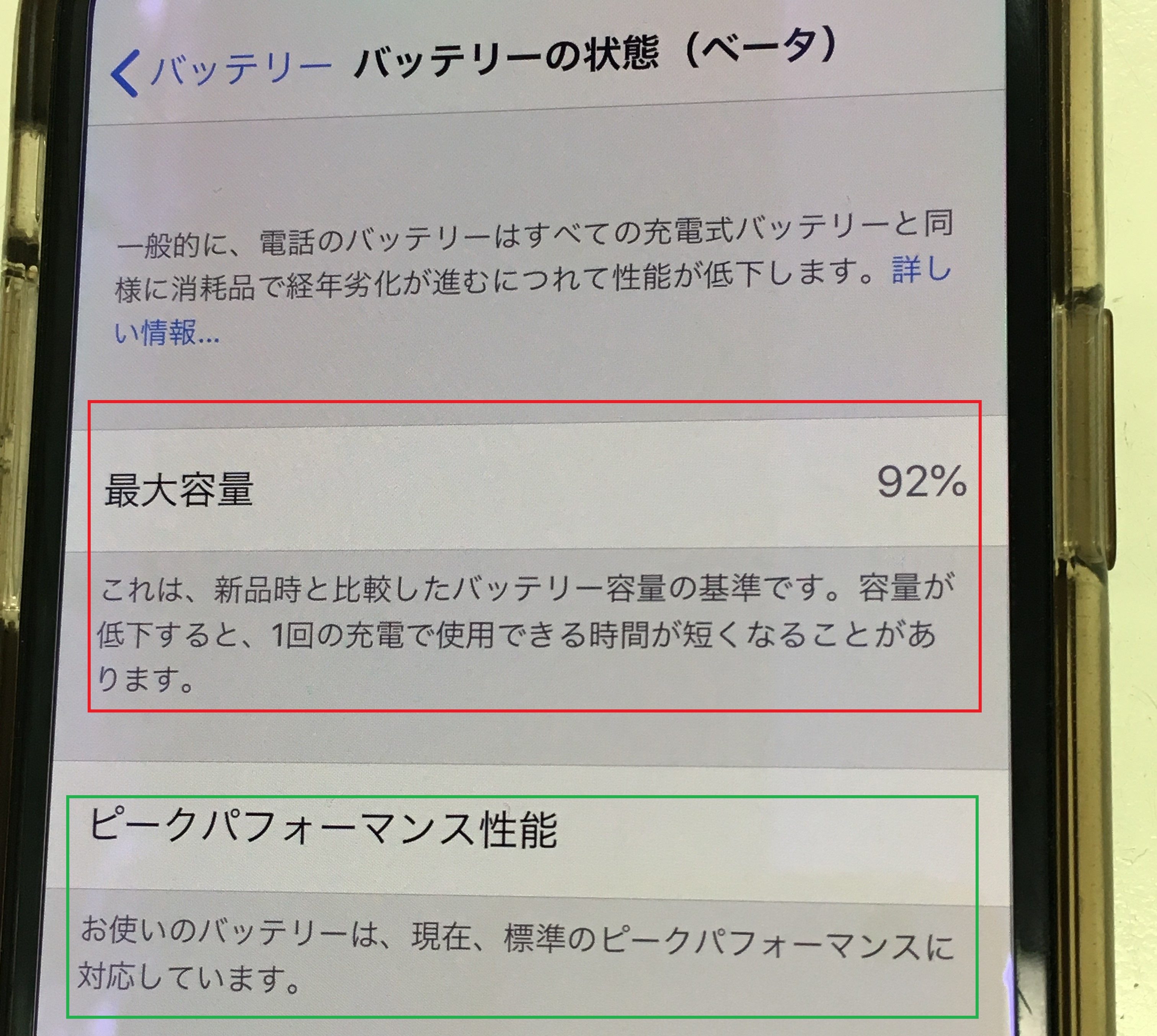 最大容量は92%、④の画像中に「ピークパフォーマンス性能」と表示されていますが、