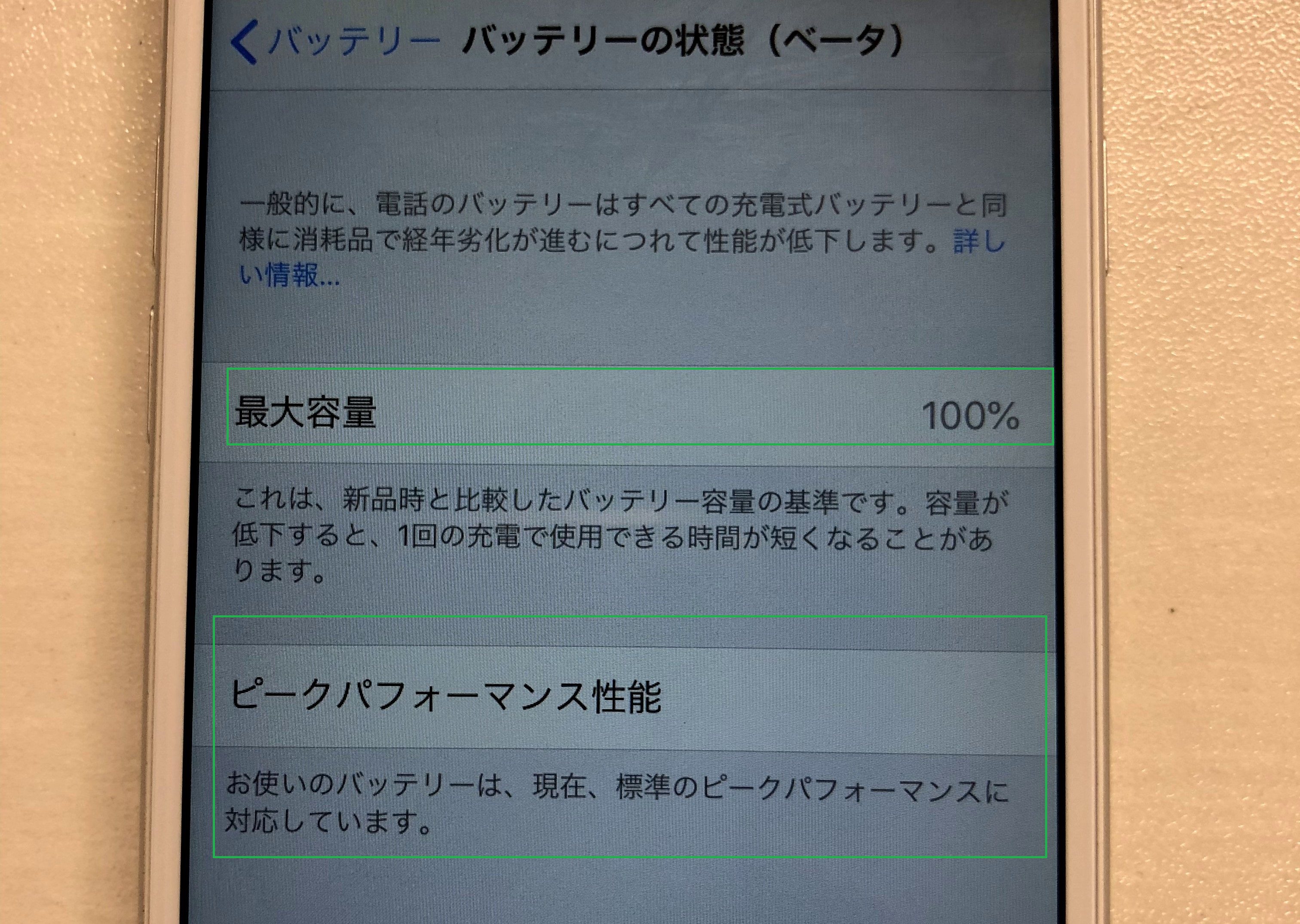 そこには「お使いのバッテリーは、現在、標準のピークパフォーマンスに対応しています」と表示されています。