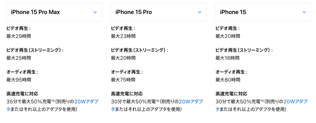 Apple公式では20Wの充電器であれば、iPhone 15、iPhone 15 Proを30分で最大50%まで充電できると公表しています。