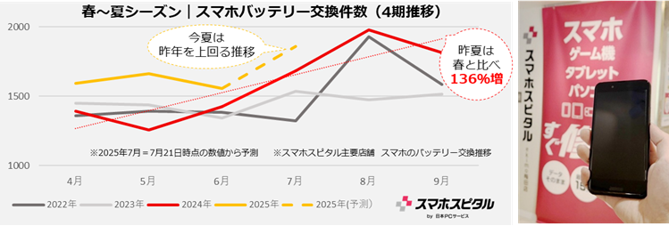 今夏も7月21日時点でバッテリー交換の依頼数は前年比で増加しています。猛暑日が続き、厳重警戒〜危険レベルの気温が予想される中、人の体調だけでなく、通勤や夏休みのイベント・レジャーでも欠かせないスマホも熱中症や予期せぬトラブルが起きないよう、日頃の取り扱いへの注意と故障前のメンテナンスが必要です。