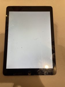 落下の衝撃により画面が真っ白になったとのことで、iPad 6をお持ち込みいただきました。この段階では、液晶パネルの故障か基板の故障かが原因として考えられます。
