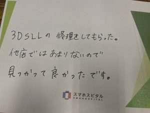 3DSLLの修理をしてもらった。他店ではあまりないので見つかってよかったです。