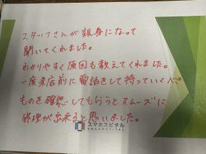 スタッフさんが親身になって聞いてくれました。 分かりやすく原因も教えてくれました。 一度来店前に電話をして、持っていくべきものを確認してもらうと スムーズに修理が出来ると思いました。