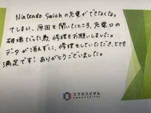 NintendoSwitchの充電が出来なくなってしまい原因を聞いたところ、充電口の破損だった為修理をお願いしました。データが消えずに修理をしていただきとても満足です!ありがとうございました。