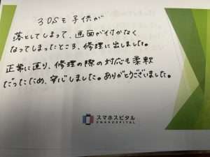 3DSを子供が落としてしまって、画面がつかなくなってしまったところ修理に出しました。正常に治り、修理の際の対応も柔軟だったため安心しました。ありがとうございました。