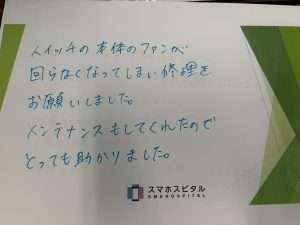 switchの本体のファンが回らなくなってしまい修理をお願いしました。メンテナンスもしてくれたのでとっても助かりました。