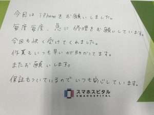 今回はiPhoneをお願いしました。毎度毎度、急に修理をお願いしています。今回も快く受けてくれました。作業もいつも早いので助かってます。またお願いします。保証もついてるのでいつも安心しています。