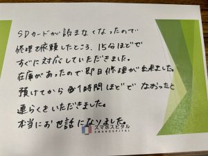 SDカードが読まなくなったので修理を依頼したところ、15分ほどですぐに対応していただきました。 在庫があったので即日修理が出来ました。 預けてから1時間ほどで治ったと連絡をいただきました。 本当にお世話になりました