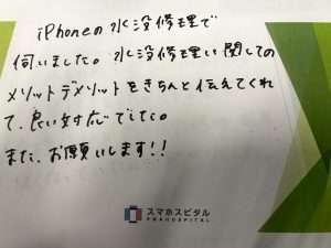iPhoneの水没修理で伺いました。水没修理に関してのメリット、デメリットをきちんと伝えてくれていい対応でした。またお願いします!