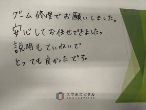 ゲーム修理でお願いしました。安心してお任せできました。 説明も丁寧でとっても良かったです。
