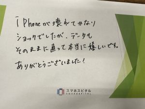 iPhoneが壊れてかなりショックでしたがデータもそのままに直って本当に嬉しいです。 ありがとうございました。