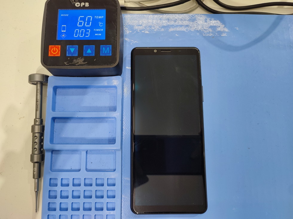 まずは、専用の加熱マットで背面を加熱し、接着を弱めます。