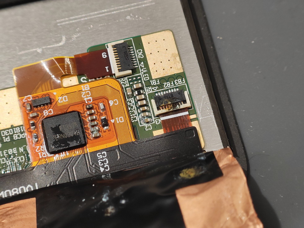 また、バックライトに繋がるコネクタは、大電流が流れる事もあってか黒くショートしています。