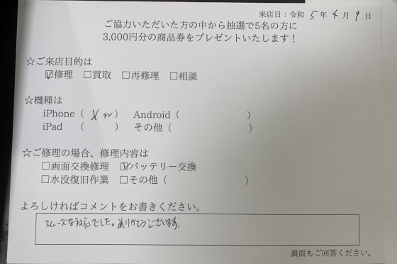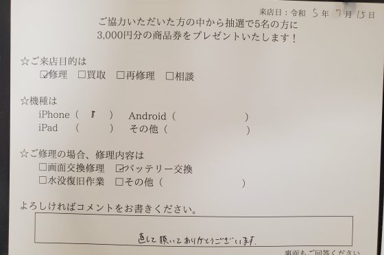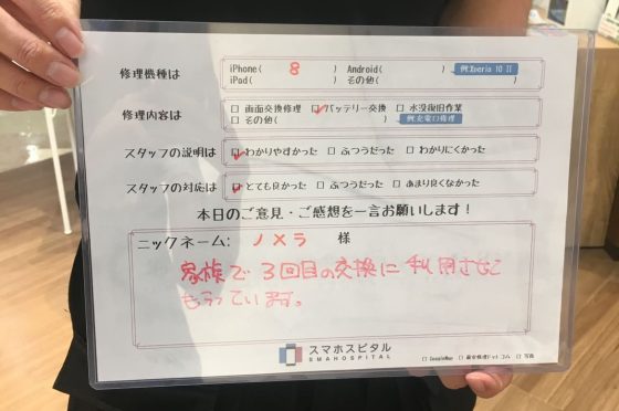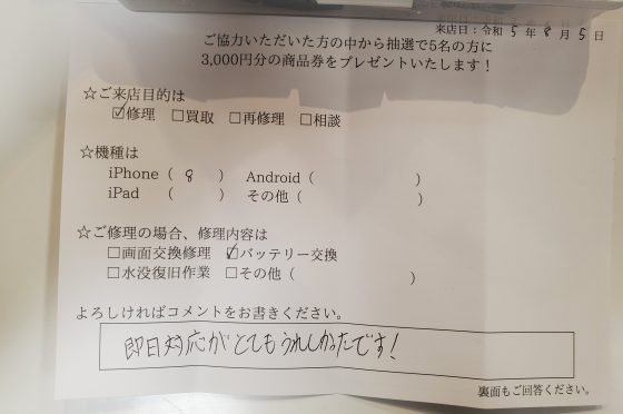 【iPhone8】バッテリー劣化よる交換修理 『ノメラ様』よりのコメントを頂きました。