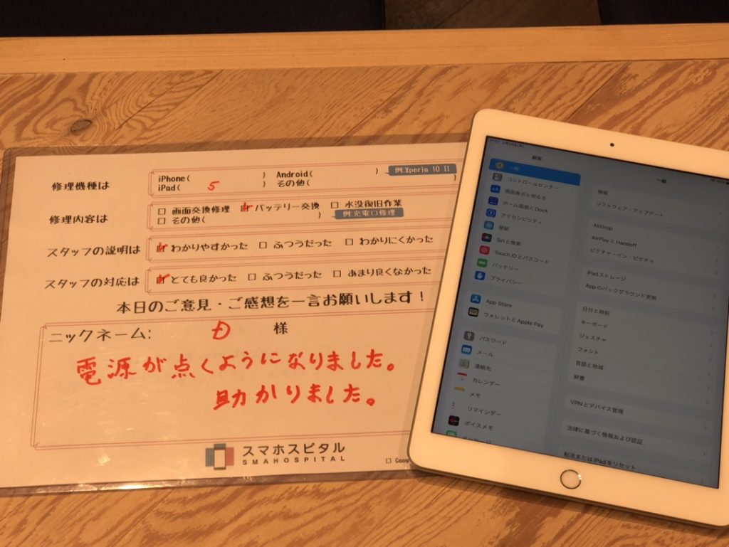スマホスピタル厚木ガーデンシティ 【iPad 第5世代】ドックコネクター(充電口)、バッテリーによる交換修理 『D様』よりのコメントを頂きました。