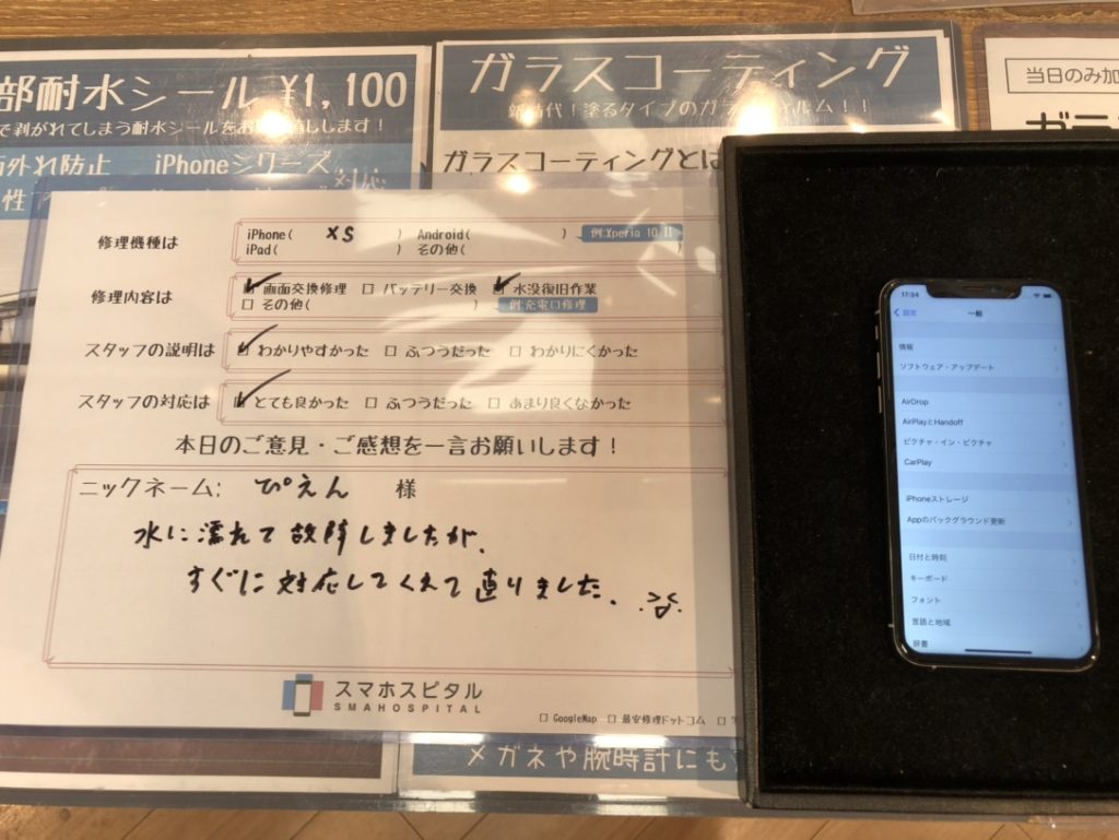 スマホスピタル厚木ガーデンシティ 【iPhone XS】水没復旧による修理 『ぴえん様』よりのコメントを頂きました。