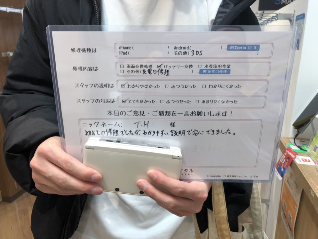 スマホスピタル厚木ガーデンシティ 【Nintendo 3DS】充電口による交換修理 『T・H様』よりのコメントを頂きました。