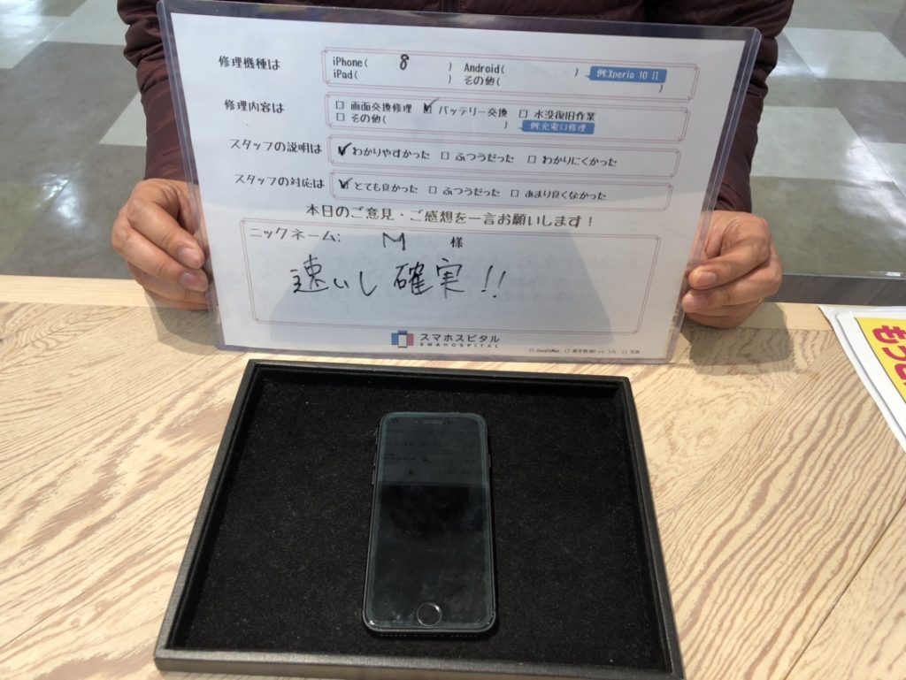 スマホスピタル厚木ガーデンシティ 【iPhone8】バッテリーによる交換修理 『M様』よりのコメントを頂きました。