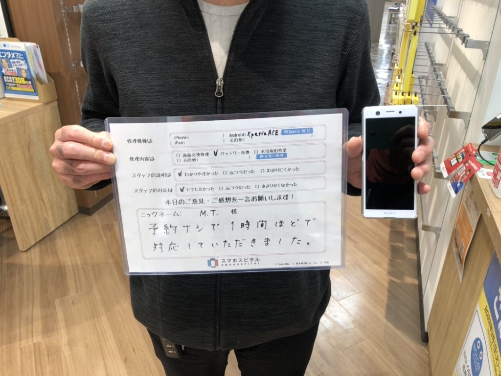 スマホスピタル厚木ガーデンシティ 【Xperia ACE】バッテリー故障による交換修理 『M.T.様』よりのコメントを頂きました。
