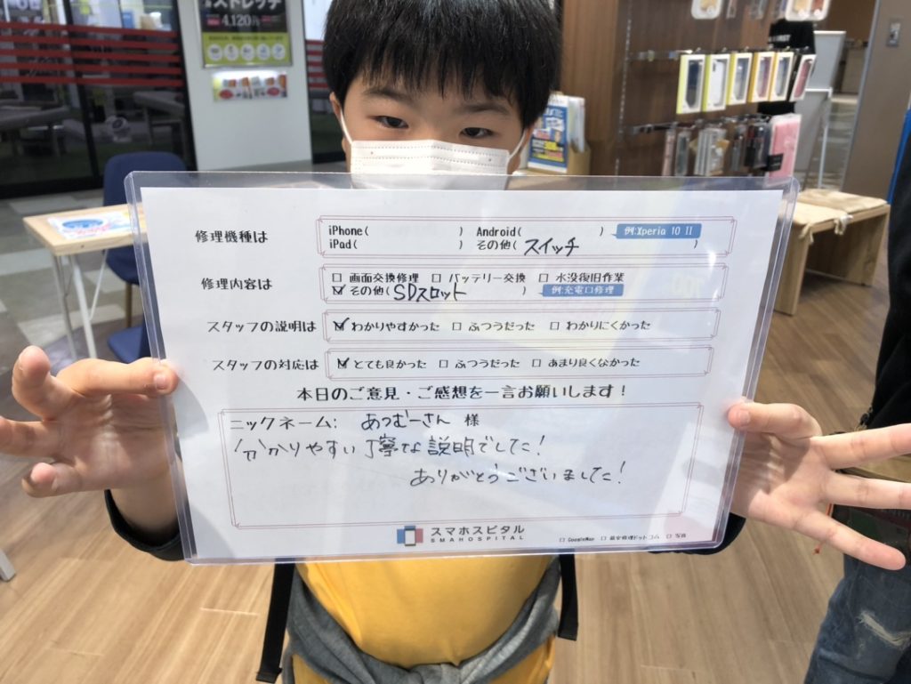 スマホスピタル厚木ガーデンシティ 【Switch】SDカードスロット故障による交換修理 『あつむーさん様』よりのコメントを頂きました。