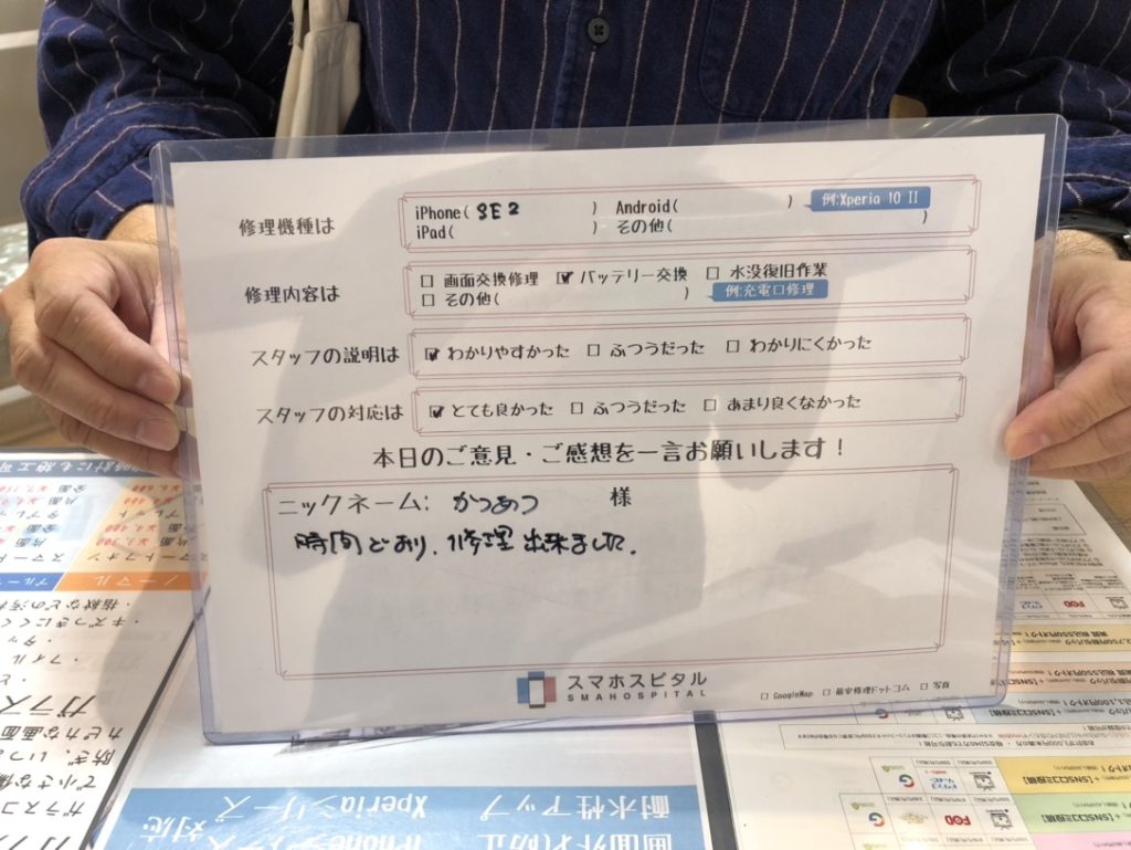 スマホスピタル厚木ガーデンシティ 【iPhone SE (2020)】バッテリー故障による交換修理 『かつあつ様』よりのコメントを頂きました。