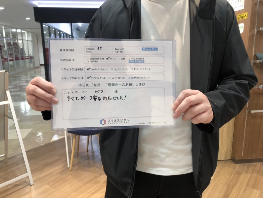 スマホスピタル厚木ガーデンシティ 【iPhone6s】バッテリー劣化による交換修理 『ゼフ様』よりのコメントを頂きました。