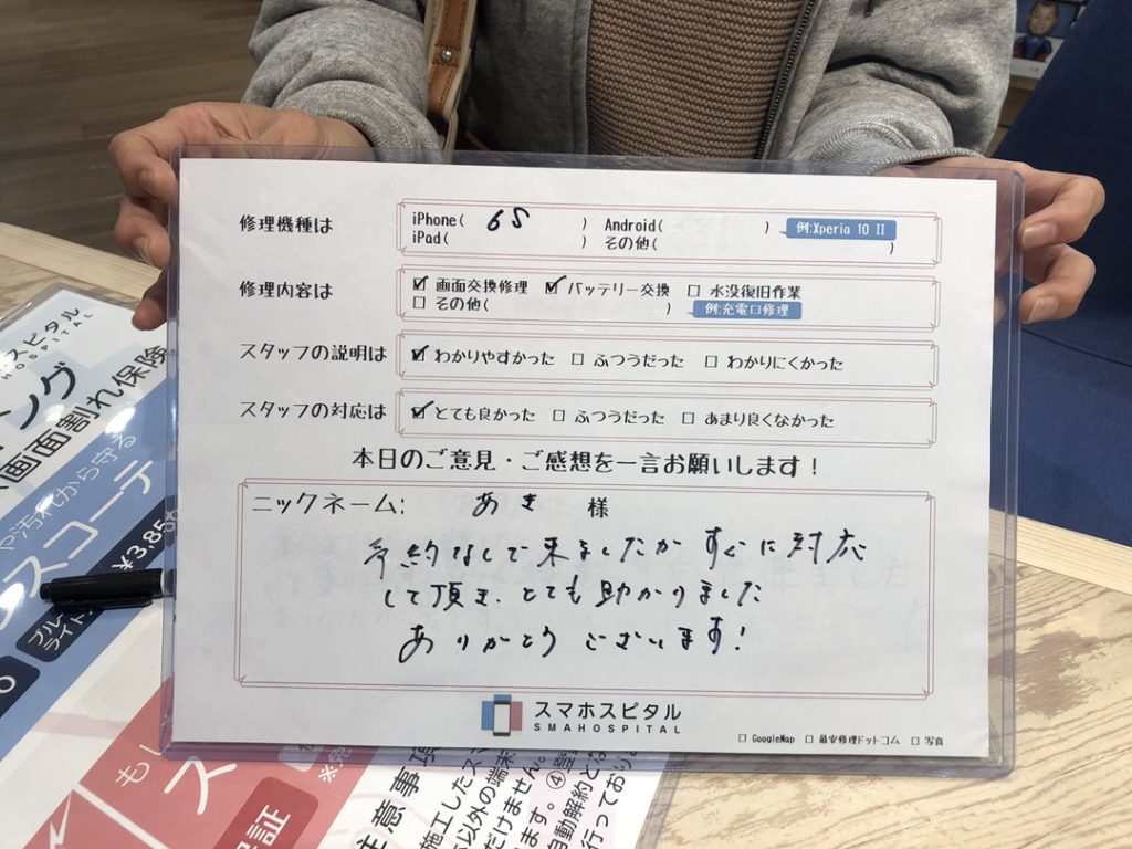 スマホスピタル厚木ガーデンシティ 【iPhone6s】画面&バッテリー交換修理 『あき様』よりのコメントを頂きました。